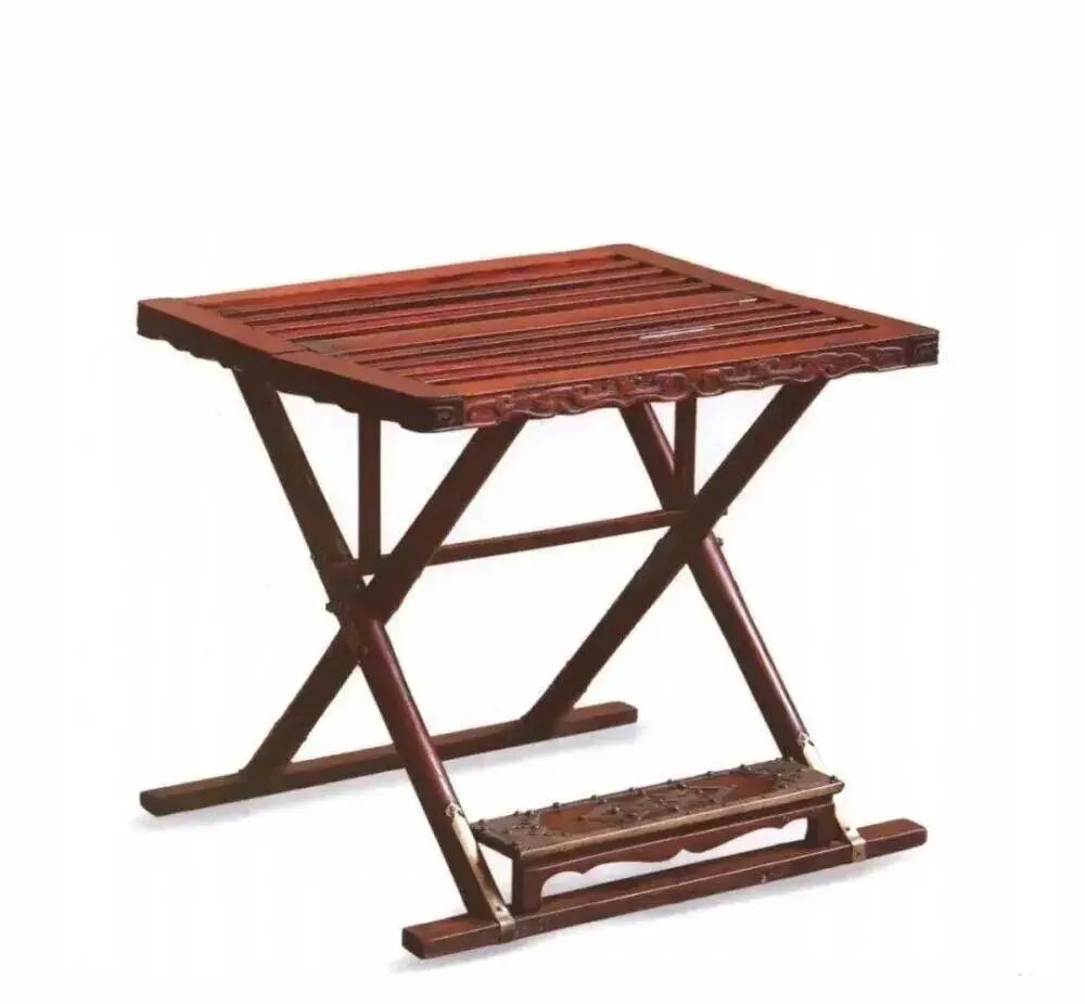 在两片硬座屉之间设一竖向木框,木框的上框较宽,两端各出两轴,插人两片硬座屉相应的孔眼内,用白铜饰件加固,转动自由。竖框的高度是关键,其高度应保证当两片硬座屉展平时,竖框的下边框恰好落在腿子相交处,使座面平正并能承受荷载。
