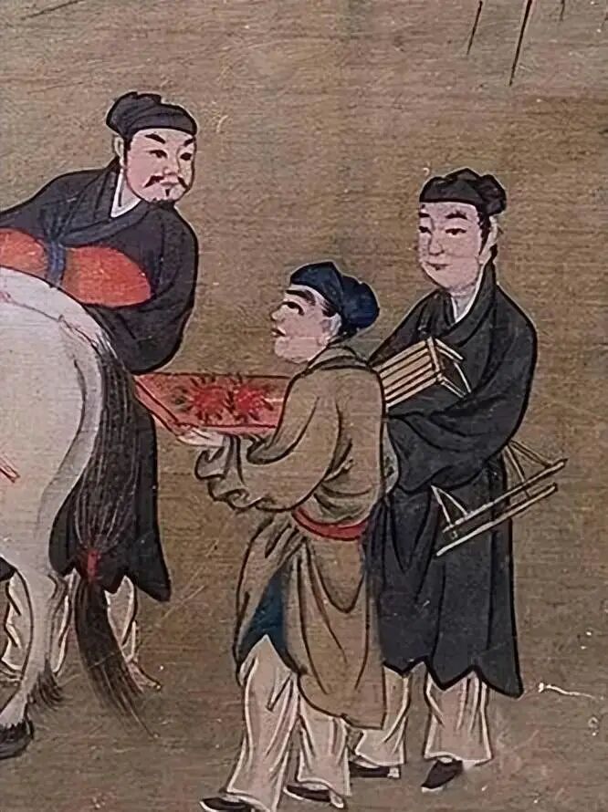 图画上,一位高官骑马春游而归,马前马后簇拥着十个仆从。二人开道,一人牵马,二人护卫,一人背大斗笠,一人扛交椅,一人担食盒、炭盆、一人提篮;一人紧跟马后,肩头所扛的正是马杌。杌深色,方面,四腿,腿间有撑。扛杌的姿势与元、明墓葬出土的肩杌俑相仿。这幅宋画,完全可以与《从驾记》、《钱氏私志》、《默记》等宋人笔记相印证。