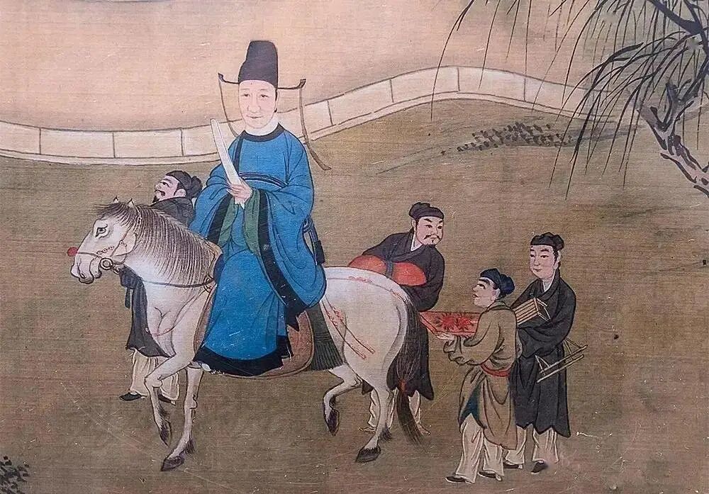 其中一幅画引起我的注意。画中于慎行着蓝袍骑着白马,四个侍从随其左右,一个牵马在前,另三人随后,其中一人抱红色包裹,一人双手托盘,一人携一马扎立于马后。