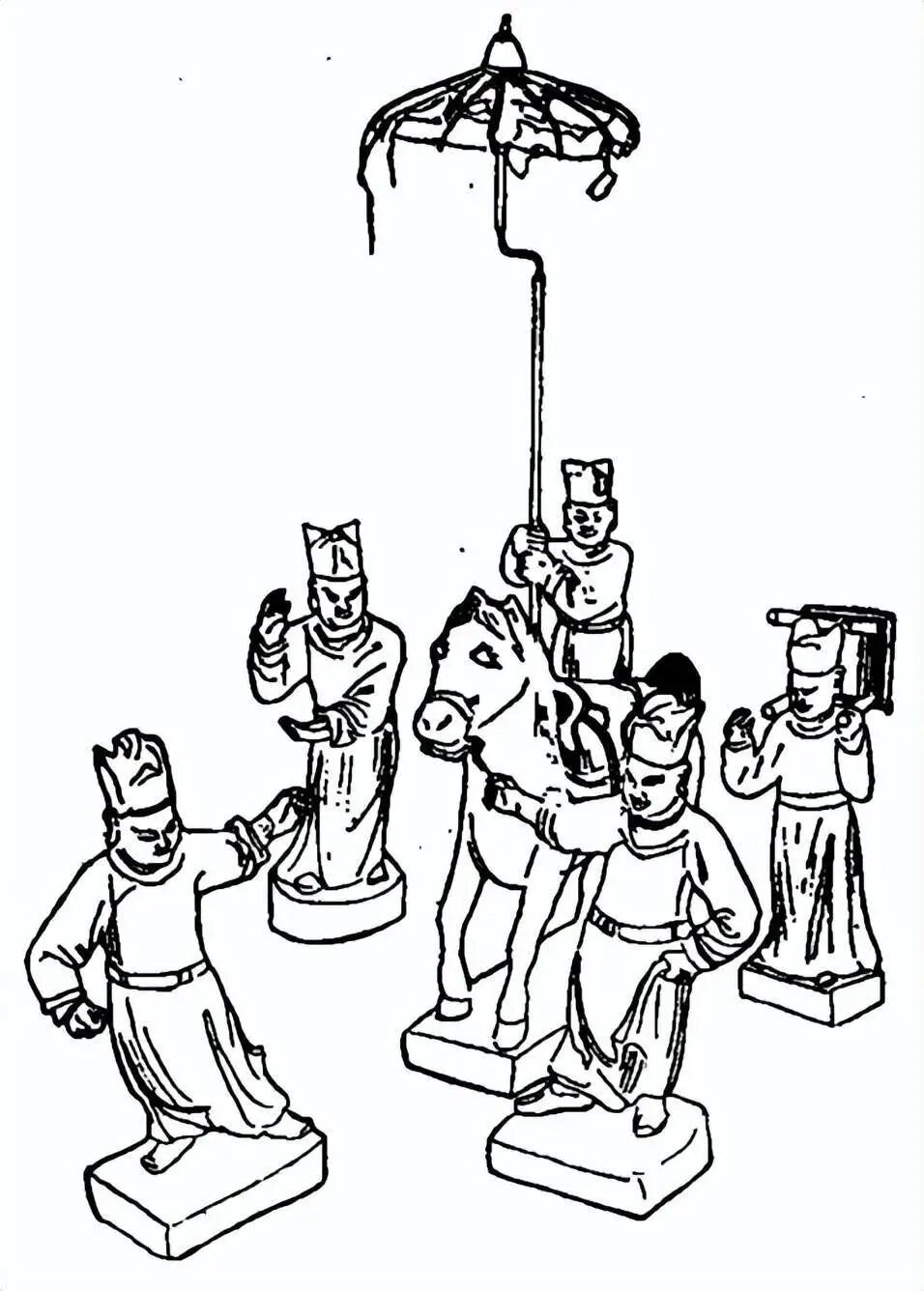 例如四川华阳县保和乡五号元墓、四川成都白马寺明魏本墓、四川华阳县明宁菊东、刘远峰墓等,都见这样的陶俑出土。四川岳池县明墓出土的石刻上,在一组出行仪仗行列里,也有在马后肩扛家具的待从形象(图一)。