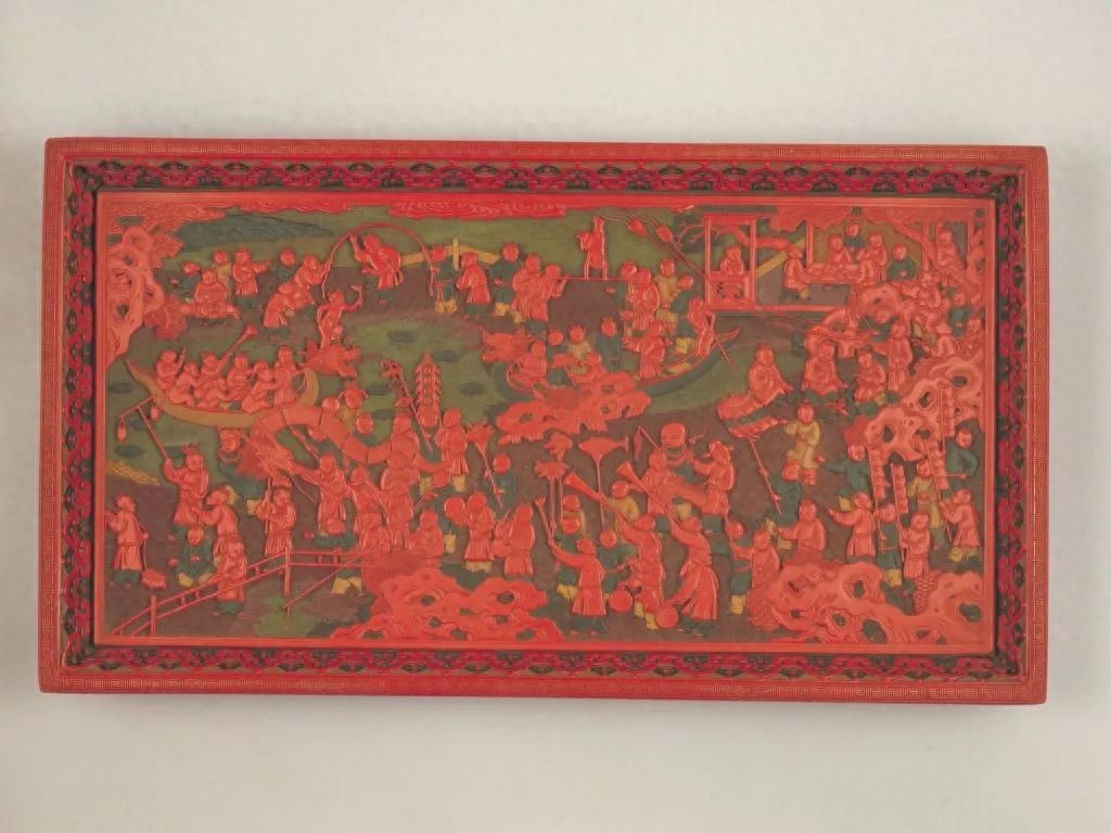 此盘雕刻精工,刀法爽利纯熟,刻痕深陡峻直,代表了清代剔彩的高超水平。乾隆时朝廷常指派苏州织造制造雕漆器具,《养心殿造办处各作成做活计清档》中有乾隆年间苏州向宫廷进“百子睟盘”的记载。此器是了解清代乾隆时期苏州雕漆工艺水平的宝贵资料。
