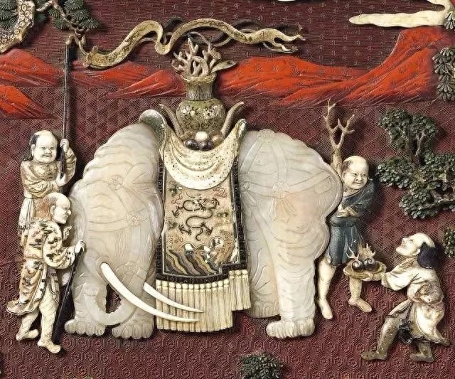 盒用玉、象牙等珍贵材质作纹饰,需不同的作坊、工匠合作方能完成。每一个细节经精心雕琢,呈现百宝嵌工艺的珍贵华丽,为乾隆朝漆器工艺顶峰之作。