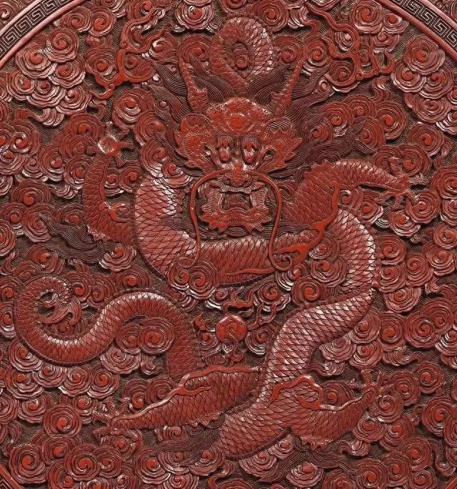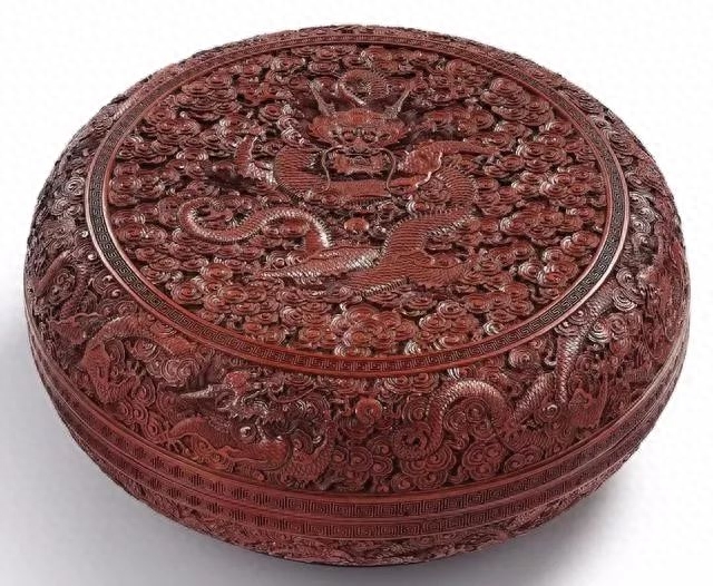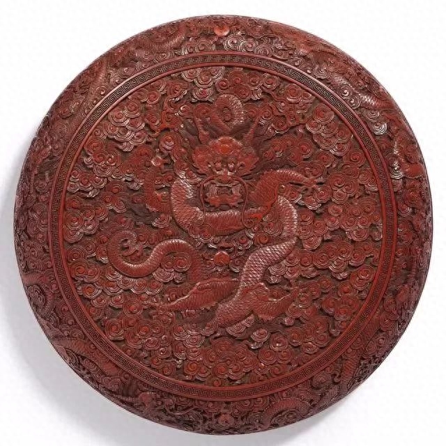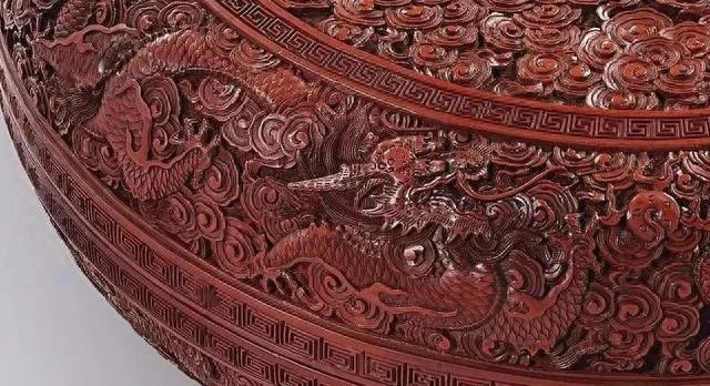 此类大型龙纹漆盒,存世甚罕。乾隆尚华丽之品,本盒型造硕大,雕饰精致繁丽、出类拔萃,是为佳证。本盒雕龙双目炯炯,獠牙锋利,神态威猛,龙爪分张利落、龙须飘展;龙身披细鳞,穿梭祥云,苍劲矫健。龙游祥云江水浪涛之上,威武雄健,气宇万千。