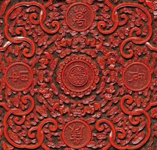 剔彩万岁长春漆盘颜色很厚、复杂色彩是乾隆时期漆器的代表。它采用红色、绿色、黑色三种颜色,水平复杂,称为“剔彩”。圆盘的中心刻有圆形古老的“寿”,周围有“万岁长春”字样。圆盘外缘的花朵和果实也象征着长寿。可以推测,这种漆盘很可能是用于存放生日礼物的托盘。