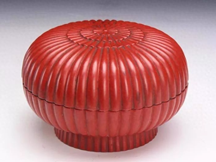 此盒制作于清乾隆四十一年(1776),朱漆菊瓣形盖盒。此器为夹紵胎,清代通称脱胎。即胎骨用绢或更轻薄的织物制成,故体轻。盒通体髹朱漆,底足内黑漆地用金漆书“乾隆年制”篆字款。款周围有金漆隶书乾隆御题五言律诗一首“髹作法前明,踵增制越精。攒英如菊秀,一朵比花轻。把手初无觉,映心似有情。设云十人谏,惭愧不期生。乾隆丙申仲春月御题”,尾钤“德”描金篆字印章款。