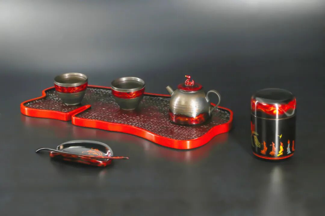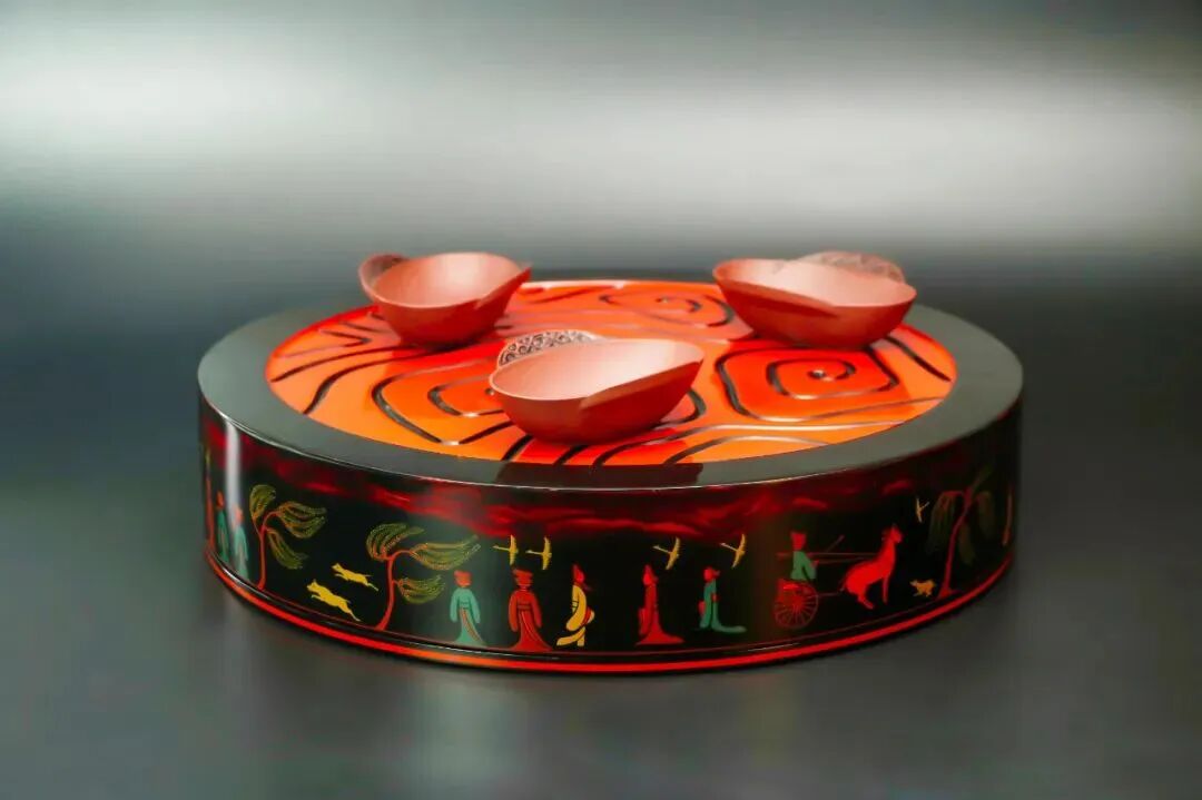 这款曲水流觞茶具便是楚式漆器髹饰技艺传承人邹传志老师根据王羲之《兰亭集序》中的典故所创作的。