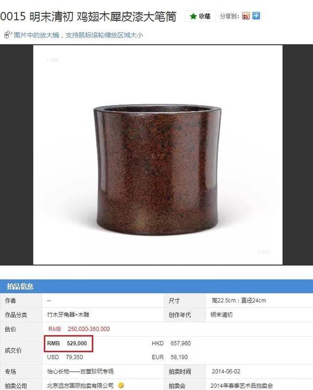 参阅:北京远方国际拍卖有限公司2014年春拍明末清初鸡翅木犀皮漆大笔筒,成交价RMB 529,000。