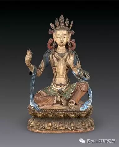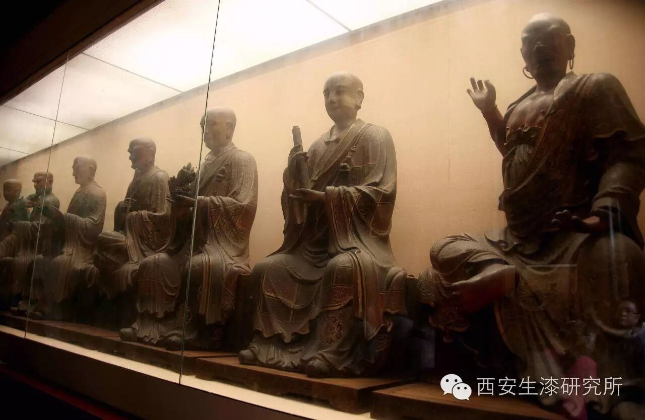 今天我们可以在公共博物馆中见到的漆雕佛像,己属凤毛鳞角,异常珍贵。其中如宋代浙江天台匠人张延皎、张延裘兄弟制作的夹纻“优填王释迦瑞像”(释迦牟尼),该尊梅檀佛象,高130cm,用魏氏櫻桃木雕成,雕像身着通肩袈裟,衣纹呈条勺线状,头髮渦状卷折,属典型印度佛造型式。后由日本僧人携至日本,至今供奉于清涼寺,已成为日本国宝。