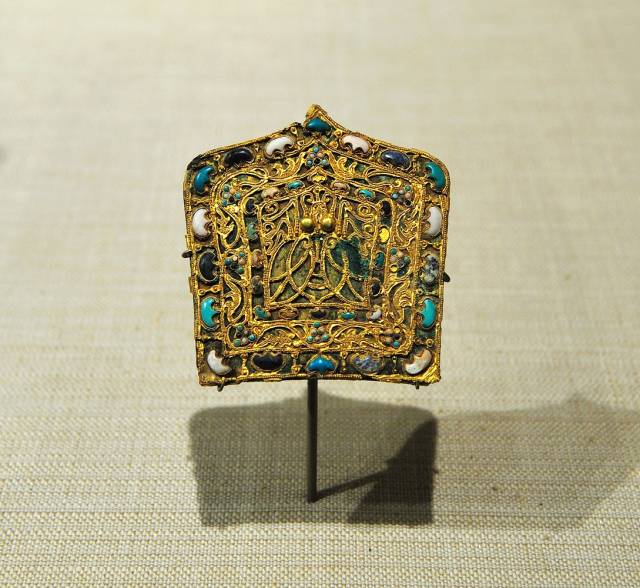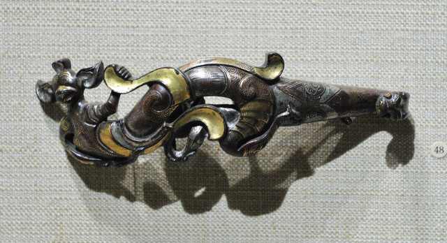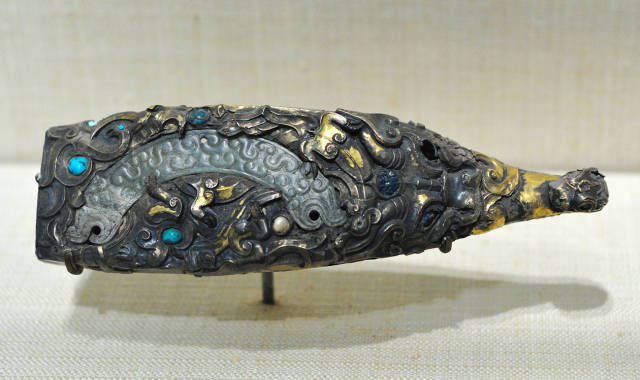 镶嵌珍珠、绿宋石和玉璜的镀金带钩战国时期长16.5cm