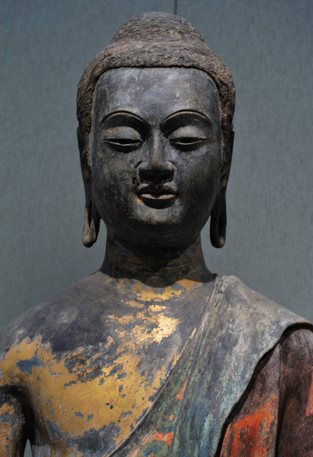 这尊佛像有近1400年的历史,为7世纪初唐朝干漆夹纻工艺制作的坐佛。造像生动细腻,宛若真人,双目有神,表情祥和,呈跏趺坐姿,身披袈裟,袒右肩,衣纹褶皱自然写实,流畅生动,袒露的胸部肌肉平滑光洁,充满弹性。袈裟表面均残留敷彩痕迹,佛像裸露的肌肤处可见较为明显的贴金痕迹,袈裟表面残留鲜艳的红,蓝敷色。大都会的签注上标注佛像来自直隶省正定大佛寺。