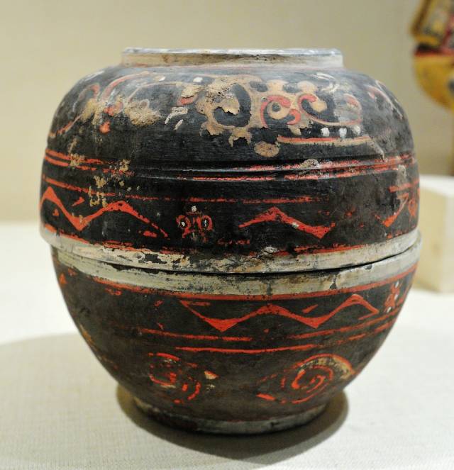 这尊彩绘陶壶,其绚丽的彩色颜料使用和自信奔放、挥洒自如的黑色笔触而达成完美的装饰效果展现了西汉时代个性张扬的一面