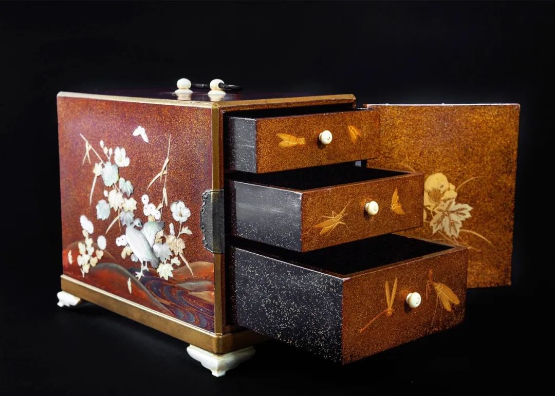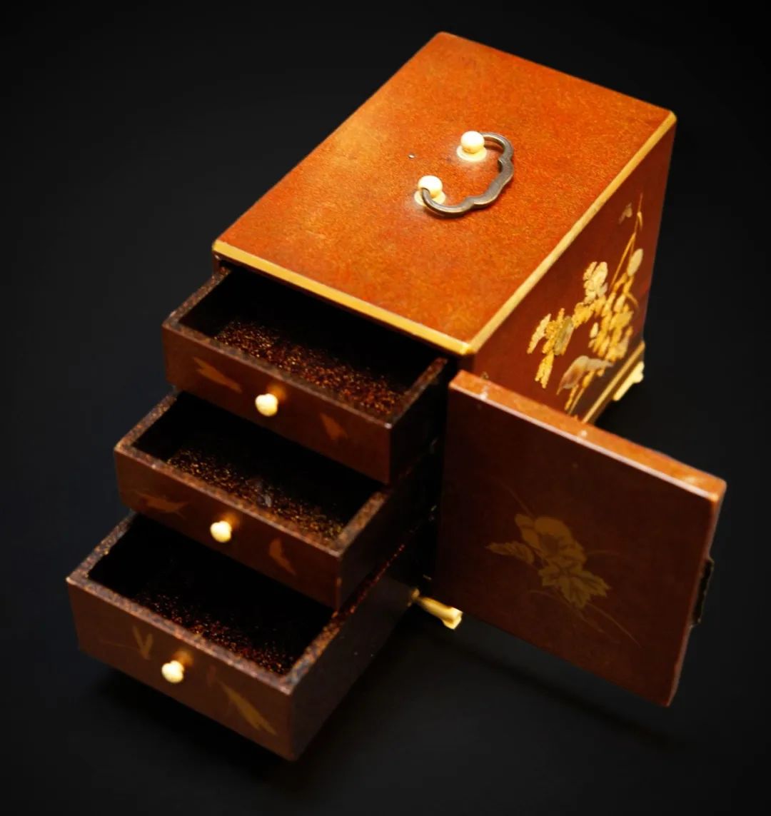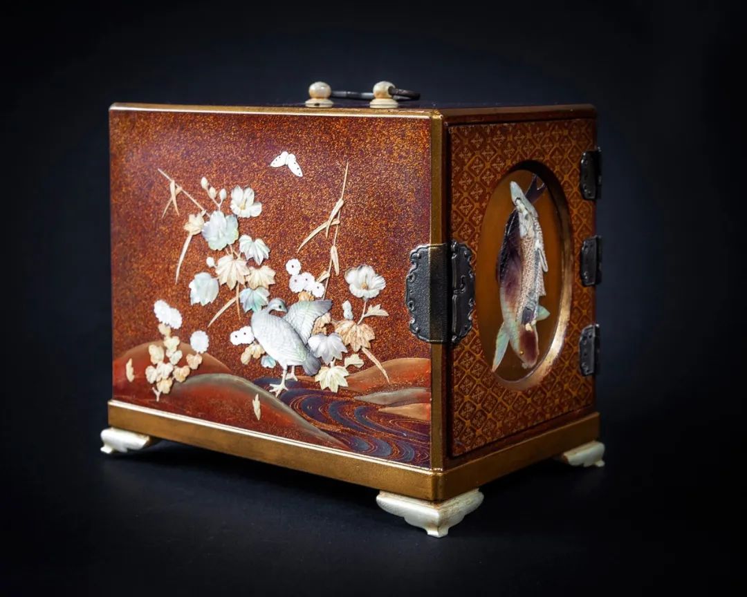 漆器源于东亚,在中国和日本都有悠久历史。但日本漆器工艺在学习了中国明朝的装饰技巧后,发展出了具有本土特色的工艺体系——“莳绘”,指将金粉撒在未干的漆上,后以透明的漆封顶的一种纹饰技巧。