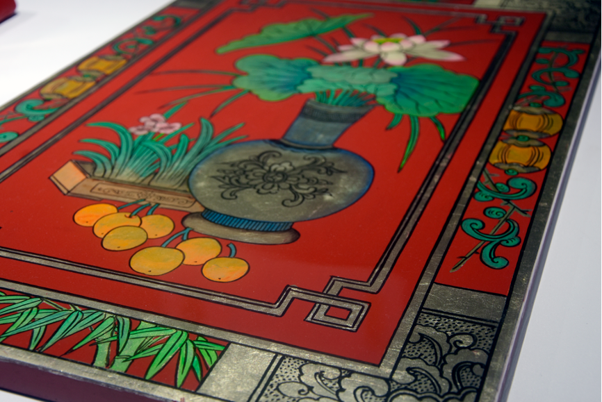 底板制作好以后,再运用镶嵌、彩绘、雕刻、晕染等技法绘制图案,也就是传统漆艺中所说的“装饰”过程。主图案创作完成,再是上透明漆、推光等步骤,和漆器的收尾部分一致。