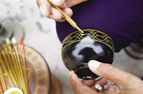 吉伍巫且告诉我,漆器最先改变的是原胚的制作,机器车削的相当廉价。其次便是漆液,传统的植物漆和矿石染料成本高,费时费力,化工原料就便宜得多。此外,传统漆液除了7~9三个月能作画,其余季节均不可用,严重制约了产量。事实上,他当时离开漆器厂,正是因为他认为漆器的改变已经走得太远了,化工漆液漆出来过于光亮,而原本庄重的明黄色被鲜艳的柠檬黄取代。