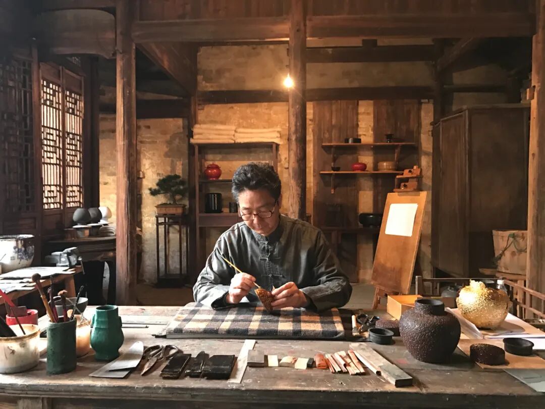 14岁开始学习做木工;24岁进入屯溪漆器工艺厂,学习画手稿、制作模型、雕刻、刻漆等;30岁在屯溪工艺美术研究所工作,接触到脱胎漆器;后来他辞职创业,在黄山屯溪老街开了一家文房四宝古董店……甘而可前半生的经历为他之后专注于徽州漆艺打下了扎实的基础。