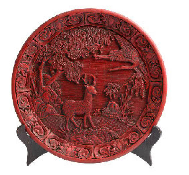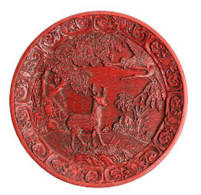 此盘木胎,圆形,浅式,圈足。通体赭色漆地上雕朱漆花纹。盘心红色的漆地上雕琢椿树竹子,山石草木,丹顶飞鹤,长角祥鹿等纹饰。盘底髹黑漆,足内正中刻“大清康熙年制” 六字楷书款。此盘雕刻精工,刀法爽利纯熟,刻痕深陡峻直,代表了清代剔彩的高超水平,具有极高的收藏价值。