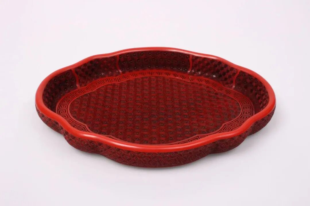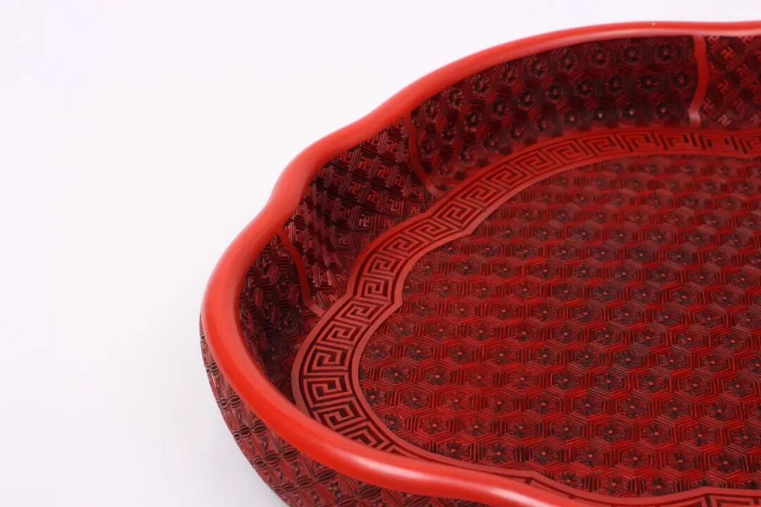 “雕漆”是漆工艺的重要品种,指在漆层上进行雕刻。简单来说,雕漆就是在胎骨上髹涂多层同一颜色或按规律髹涂不同颜色的漆,根据作品的属性,有木胎、瓷胎、金属胎等,少则几十层,多则上百层,达到一定厚度后,待漆层半干时描上画稿,再刻出所需纹样。一般以各种底纹为地,花纹隐起,华美富丽。