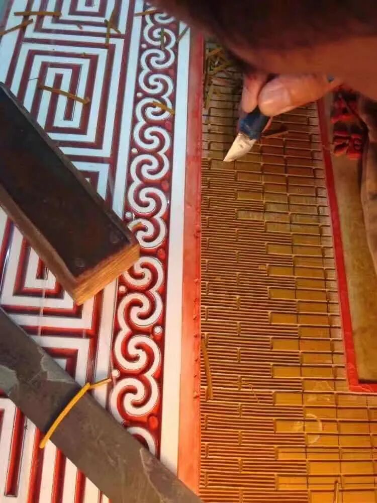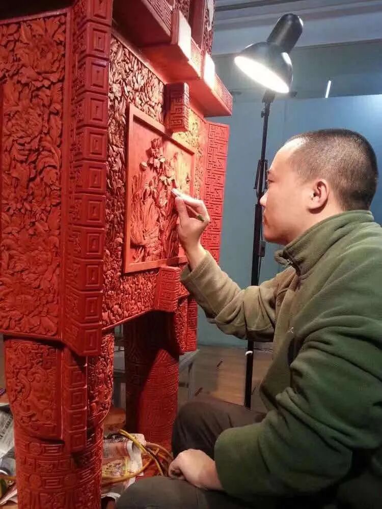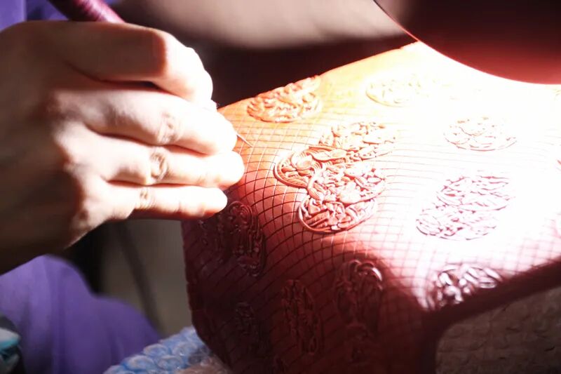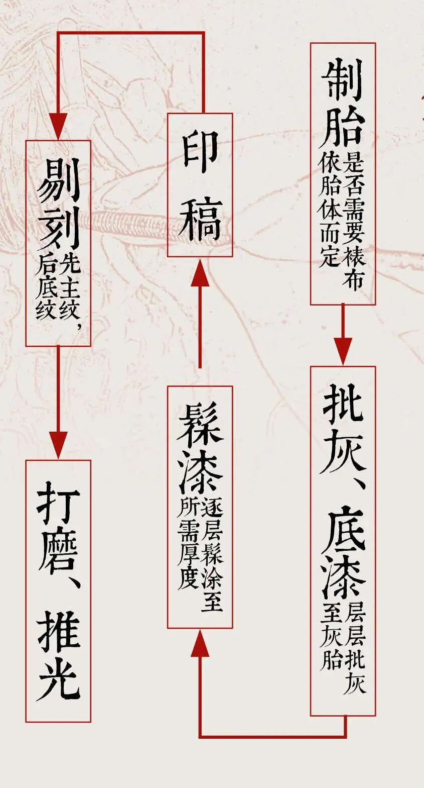 一件雕漆作品要经历“制胎”、“批灰上底漆”、“髹漆”、“印稿”、“剔刻”,最后打磨、推光才算完工。