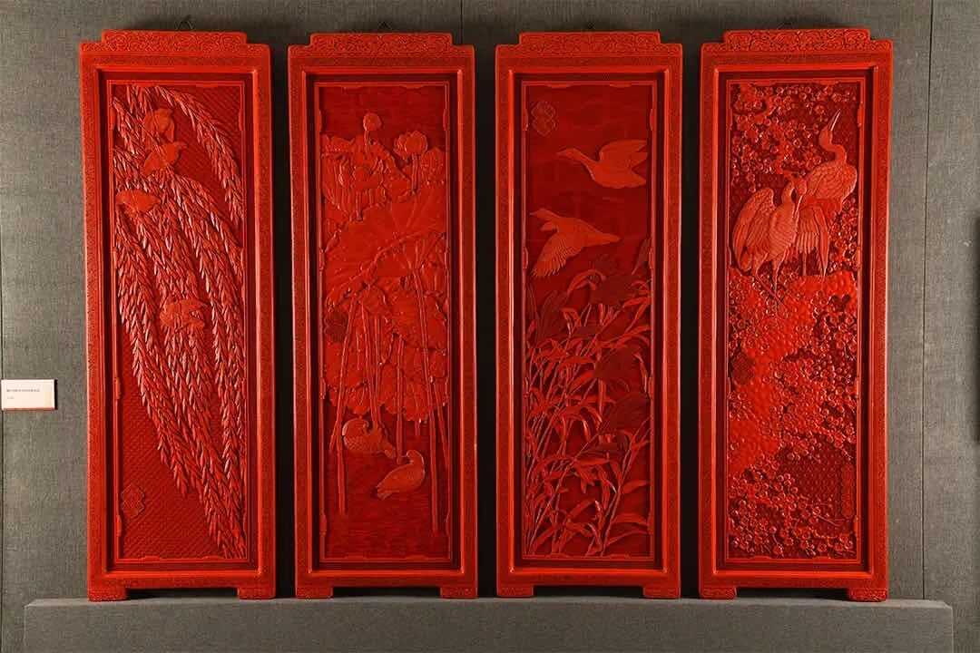 ▶当代剔红四时花鸟纹四扇条屏 文乾刚浙江省博物馆展出