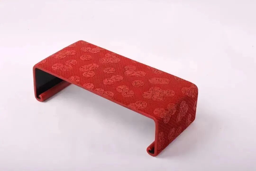 李小龙此时雕琢的就是一件通体火红的“书几”,在略微昏暗的工作间里,这抹火红成为耀眼的存在。