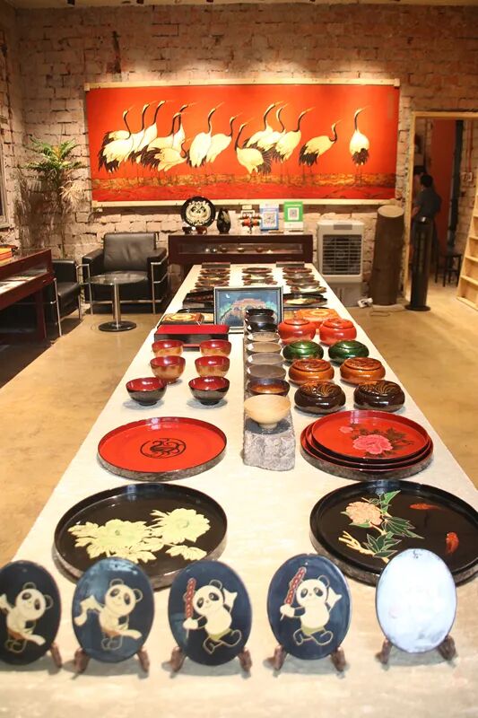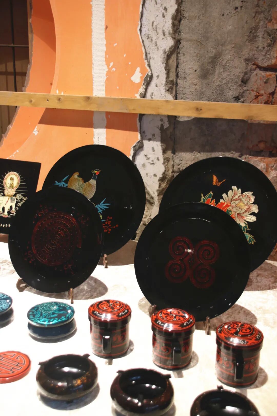 在漆器厂门店中就陈列着许多贴近大众生活化的器件,如漆盘、女性使用的漆梳、大漆手镯、发簪等装饰品,还有独具成都特色的旅游纪念品,虽然小巧,亦流光溢彩,仔细端详,细微之处更别具匠心。