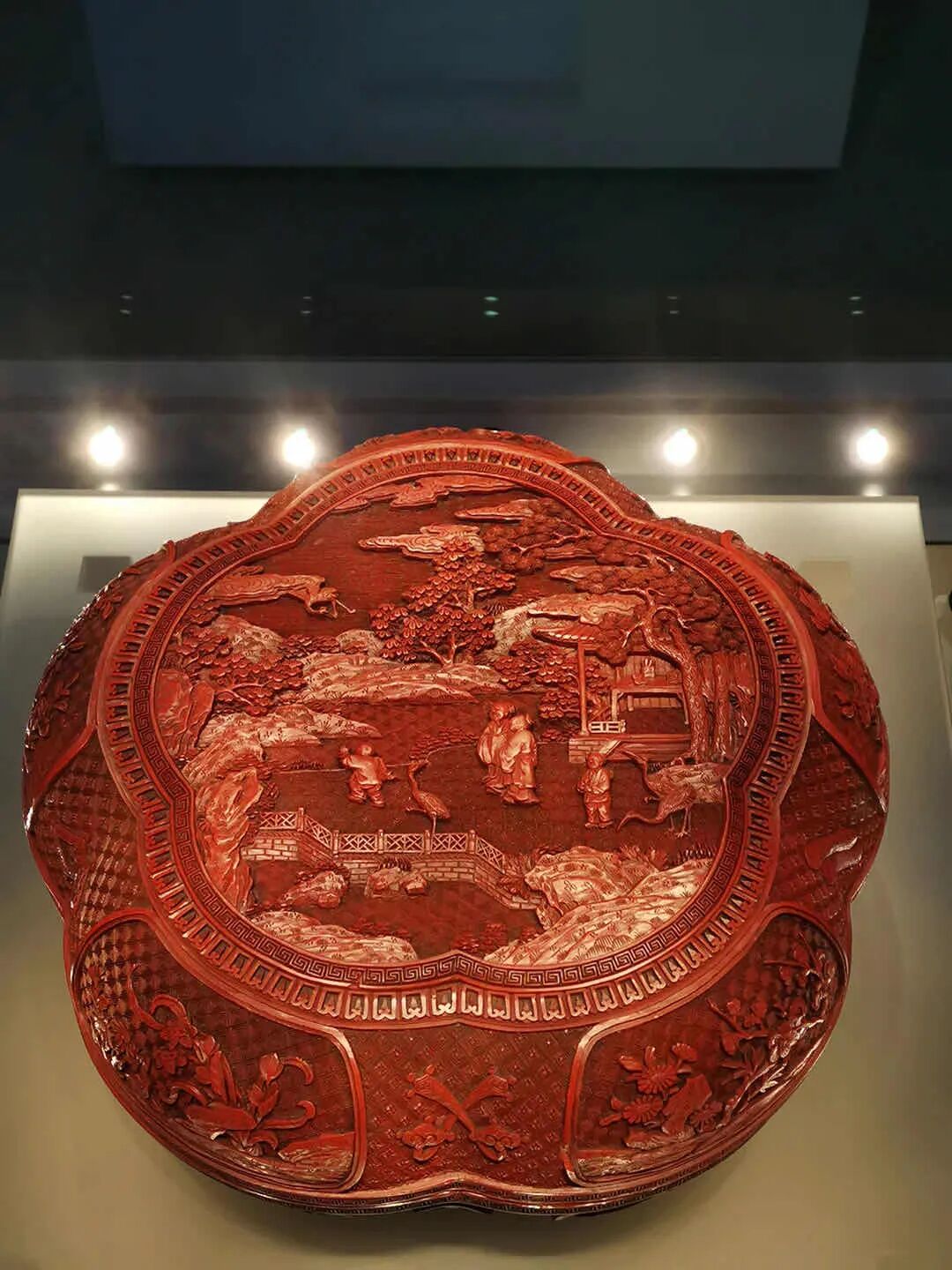 ▶清中期 剔红山水人物纹梅花式盒 浙江省博物馆藏