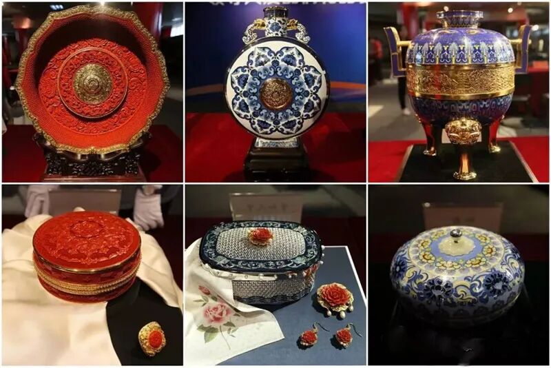 2017年一带一路峰会国礼六件套:分别是《丝路绽放》雕漆赏盘、《共襄盛事》景泰蓝赏瓶、《和合宝鼎》珐琅器、《和合之美》捧盒套装、《梦和天下》首饰盒套装以及《和韵》捧盒,都是由工美集团设计制作的。