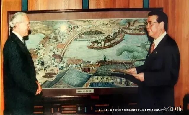 1996年,李鹏赠送联合国粮农组织的丝绫堆绣作品《清明上河图》虹桥部分。