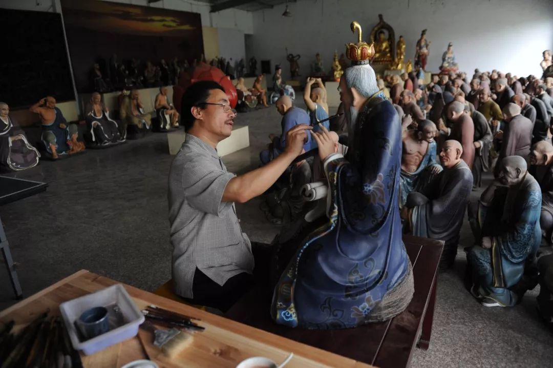 对于造像,徐俊贤的要求近乎苛刻。一般而言,生产企业承接造像业务,往往照搬某一地造像的外造型,往往顾形不顾神,而且越翻模越差,就像是“面无表情的泥塑木偶”。徐俊贤则在造像前,先去研究要造像的这个人物。他认为,佛像不是凭空捏造的,每一个都是有出处和造型依据的,都是有“故事”的人物。另外,佛像是有创造空间的,不同审美需求,不同的陈列空间,对于造像的造型、色彩要求都是不同的。最重要的是,造像人必须怀着虔诚崇敬之心,以形传神,才能打动信众生起恭敬心和欢喜心。