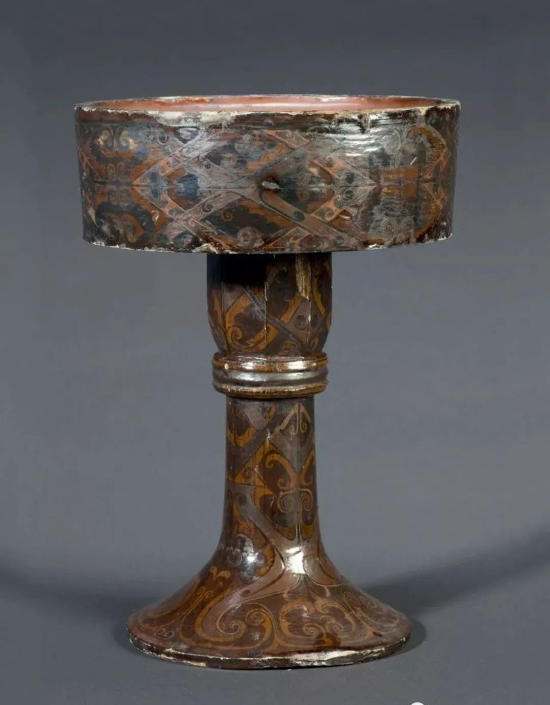 彩绘云鸟纹漆豆从上至下由圆盘、细把喇叭形底座榫卯接合而成,器形优雅,结构稳固。通体用朱、黑、褐、黄漆交替绘菱形纹、云纹、变形凤鸟纹。云鸟纹漫卷交织,畅如流水,一气呵成,体现了当时漆器制胎、髹涂、描绘等诸方面工艺的成熟。