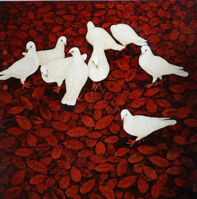 红色是大漆表现最到位的色彩。我的老师李芝卿,把日本的漆艺跟中国漆艺结合,创作出非常感动人的技法,叫赤宝砂。我用赤宝砂工艺,把真的叶子涂上朱红色的漆,拓印在中涂漆板上,斑驳的肌理充分体现出秋意来。