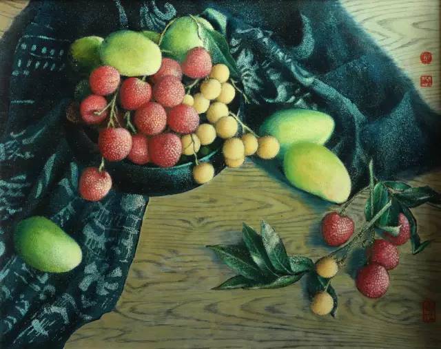 我家门口种有芒果,到成熟时满地都掉芒果。小时候我经常爬在水果树上吃水果,跟家乡荔枝、龙眼等水果的感情很深。我把这种爱也画进了作品里。