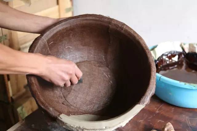 刷完以后裱夏布,用生漆面和夏布裱上去,裱夏布最多裱两层就够了,裱完以后刮粗灰,粗灰刮完以后刮中灰。之后开始里外罩漆。