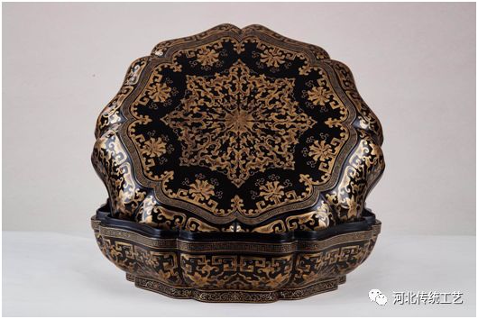 此盒为脱胎制作,通体髹黑漆为地,用金胶漆打底,辅以金箔勾勒出花筋叶脉。盒盖搜金随行开光,彩绘八幅勾莲纹组成的八角花卉纹样,边饰勾莲花卉,拐子纹样,口沿饰回纹图案。此盒设计精美,是一件集实用与欣赏为一体的漆工艺品。