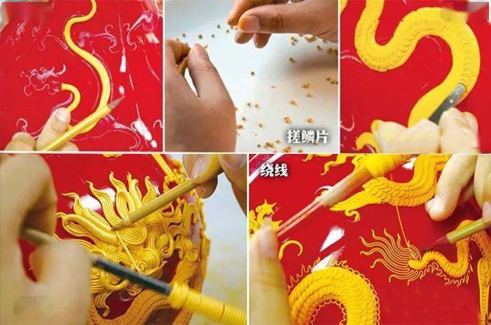 漆线雕的发展,无不受到刺绣的引导。刺绣工艺的好坏不在于图案布局的细密,而在于其层次的丰富和针法的巧妙;漆线雕的魅力亦在用线条构造层次。龙凤,是漆线雕最善于表现的题材之一,层层盘叠的漆线,能够制造出龙身的浮雕效果。