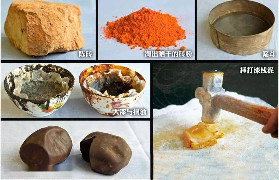 华丽漆线的主要材料是砖块。这砖块很有讲究,绝不能用新砖,必须是质地松软的陈年生砖,甚至可以从坍塌的砖房里取材。将砖泡在大水缸内,让它自然沉淀,仅取漂在上层的极细颗粒,用筛斗过滤,因为任何一颗较粗的颗粒,都会毁了整幅作品。砖粉晒干后,与大漆和桐油混合,经过数小时的反复捶打,方能得到柔韧的漆线泥。