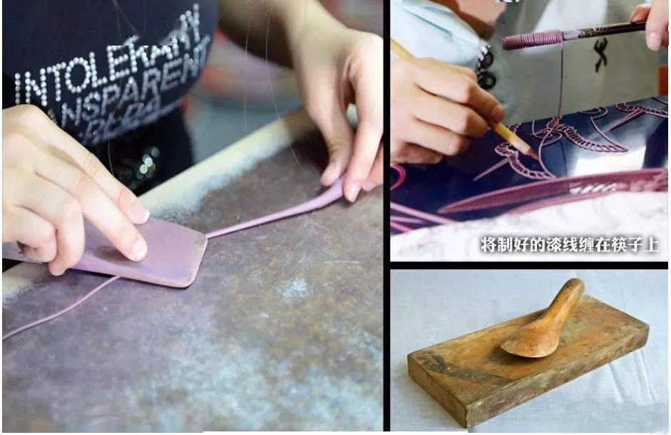 漆线泥极富弹性,艺人们可以根据需要,将其搓成粗细不同的漆线,最细竟可以搓成直径0.05毫米的细丝。细线搓好后,被缠在筷子一头,艺人们便可开始盘绕图案了。