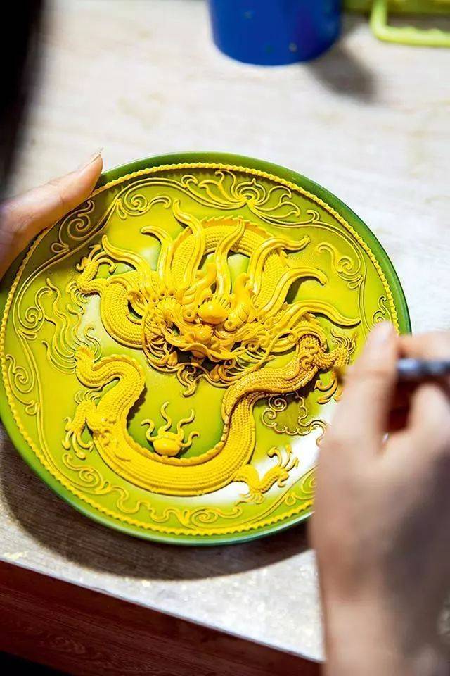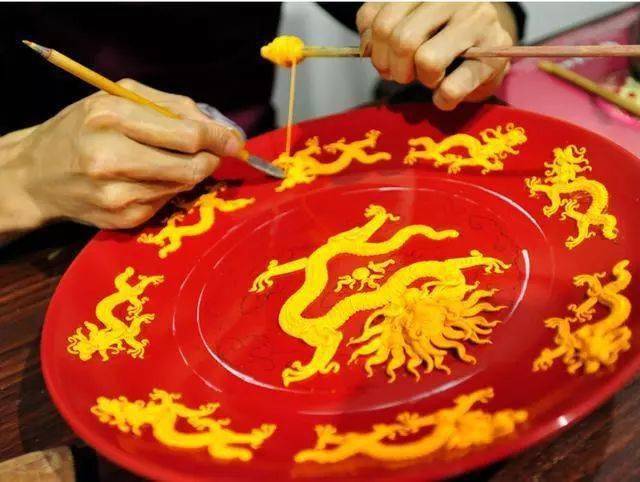 漆线雕以精细的漆线经特殊的制作方法缠绕出各种金碧辉煌的人物及动物形象,尤以民间传统题材,如龙凤、麒麟、云水、缠枝莲等为多。从漆线雕大都只限于木本、漆篮和戏剧道具上,逐渐发展到装饰在盘、瓶、炉等瓷器和玻璃器皿上,琳琅满目,并且不断推陈出新,表层还安贴24K金箔。
