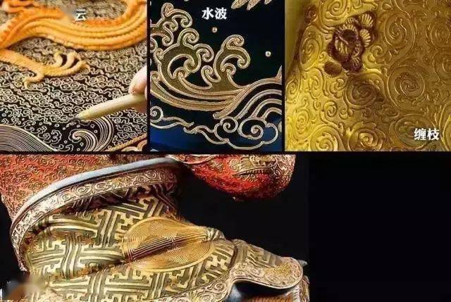 一根柔韧的漆线,经过艺人之手,能够升华出千变万化的纹饰。龙凤、祥云、海水江崖、缠枝牡丹、团花、禽鸟、瑞兽和锦绣是漆线雕的常见纹饰。漆线贴金之后的纹饰不仅更加牢固,而且漆线产生的独特的凹凸感使作品倍加华贵。