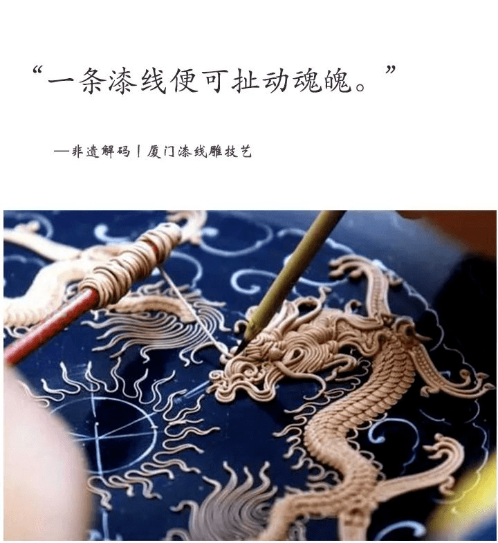 漆线雕工艺在厦门流传三百余年,历经蔡氏13代传人。这一工艺系古代佛像雕塑艺术的遗脉,是受宋元线雕工艺特别是沥粉和泥线雕的启发而产生的。它形成于明末清初,至晚清时逐渐成熟,在厦门地区的发展与民间宗教的兴盛及神佛雕塑行业的繁荣密不可分。