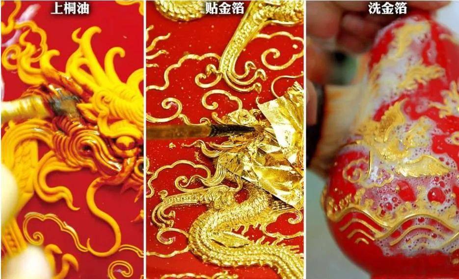 安金工艺极具难度。首先,漆线雕一般取金箔中成色最好的南京产足赤金,以保证效果最闪亮。贴金箔前,需在相应部位刷上桐油,而后搁置一夜,时间不可长也不可短。金箔需用小镊子和细毛笔配合贴上,一个中等大的花瓶通常需要300张金箔。洗金过程,更是需要艺人小心翼翼。有些人的作品多年闪亮,而有些人的作品三两年就暗淡,与刷油手法、搁置时间、控制贴金力道均有直接关系。