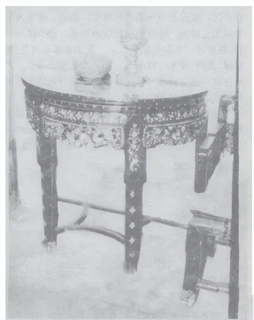 如图6螺钿半圆桌,桌面边框上嵌“条”蚌片, 拼成香草纹样,正面等距嵌小圆形螺片。腿上部嵌香草图案,下部用小菱形贝壳嵌成菱花。花牙板透雕后嵌“喜鹊登梅”有层次高浮雕状螺壳,梅花瓣五片各有起伏变化梅蕊突出甚高,详见细部照(图34)。