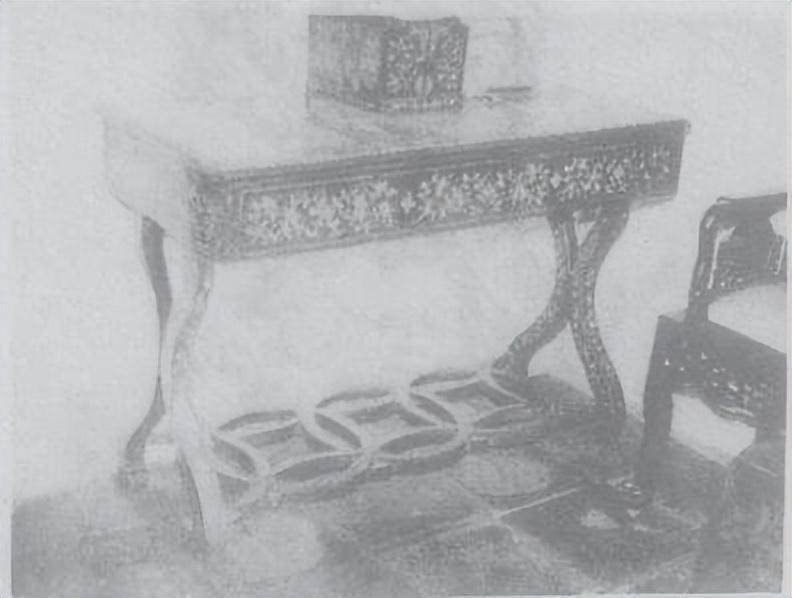 整个桌子的造型秀丽优美,加之贝壳不同截面的不同颜色,更显得斑驳奇丽,给娇小玲珑的制品增加了光怪陆离的效果。