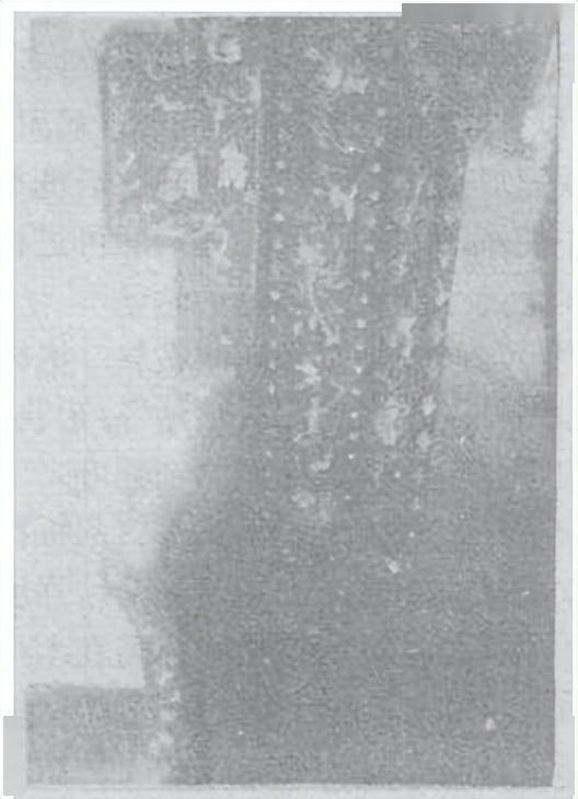 图42是穿衣镜的边框立柱和加宽的站牙,可以看到镶嵌内容很丰富,上图人物故事是“八仙过海”是“明八仙”,镜口条外边框上嵌花篮、葫芦、笛子……,为“暗八仙"”,其它还有花草纹等嵌饰, 一贝之上竞汇聚了如此众多的贝嵌题材,宛如一件嵌螺钿艺术的“百科全书”。