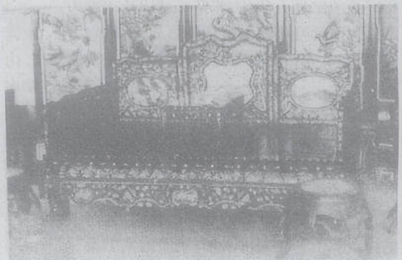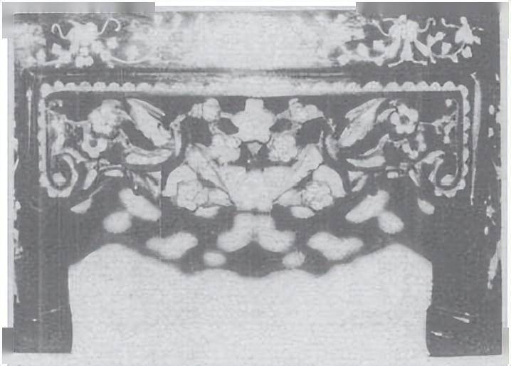 本文所提图39螺钿榻,尺寸较大,榻上置对称布局,高低错落的五扇屏,屏心嵌大理石,其它部分满嵌花草纹螺壳。腿上部雕衔环“螭首”,下部是兽爪脚。花牙板透雕后镶嵌如意、花篮、“喜鹊登梅”等“吉祥图 案”。和图47尺寸较小的皇榻造型、镶嵌风格基本相似。