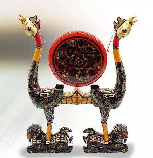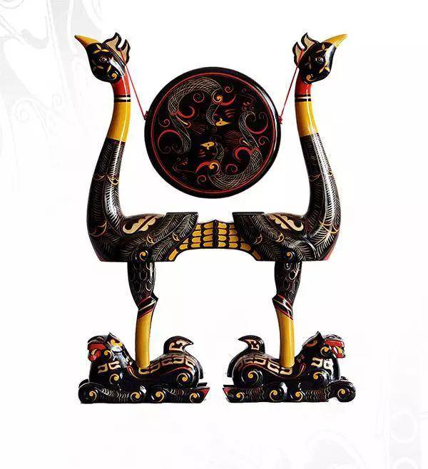 虎座鸟架鼓是战国时期楚国的重要乐器,具有浓厚的楚文化特色。两只昂首卷尾、四肢屈伏、 背向而踞的卧虎为底座,虎背上各立一只长腿昂首引吭高歌的鸣凤,背向而立的鸣凤中间,一面大骨用红绳带悬于凤冠之上,通体髹黑漆为低,以红、黄、金等色彩绘出虎斑纹和凤的羽毛,绚丽辉煌,雕刻和绘画工艺水平高超。