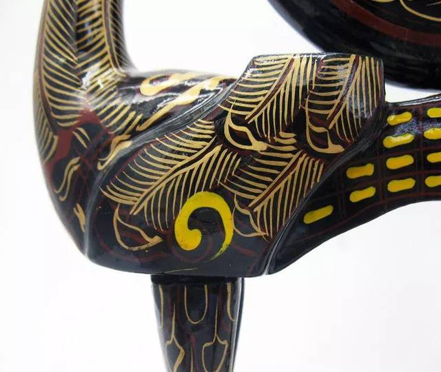 战国时期的楚国漆器中,雕刻各种动物形象的木胎漆器数量众多,造型新颖别致,花纹华彩灿然,是该时期楚国漆器的一大特色。