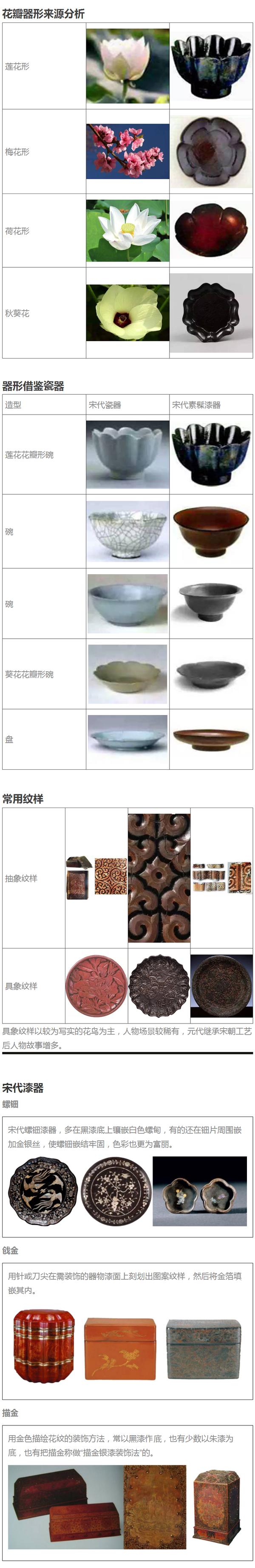 宋代漆器中最著名的品种是素髹漆器,即单色漆器,红黑褐三色和犀皮。花瓣器形广泛应用,抽象纹理卷草为主,具象纹路花鸟写实为主,后期有人物故事图,最具代表性的装饰有螺钿、戗金、堆红等。