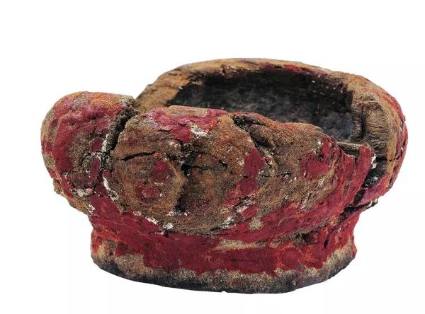 它是由一块木头镟挖而成,因壁厚而显得较为笨拙。口部内收,腹线较深及圈足较高的造型,几条若隐若现的外壁腹线,使碗的整体造型呈瓜棱状。碗的外壁有一层薄薄的朱红色涂料,微见光泽。