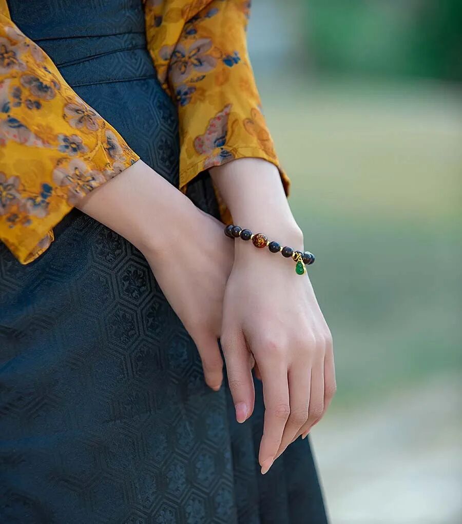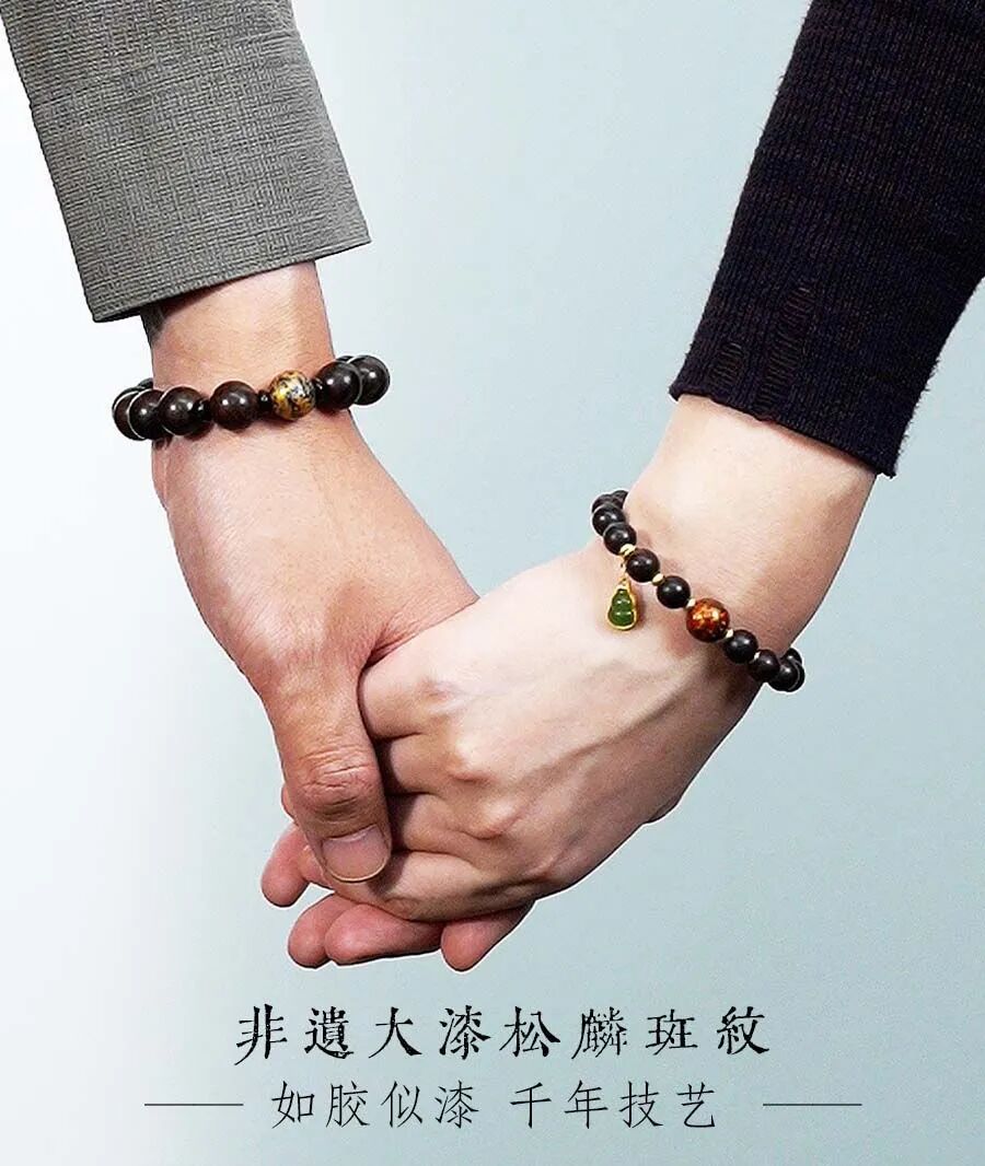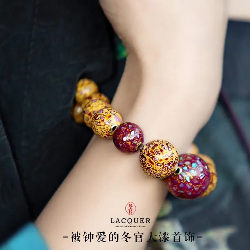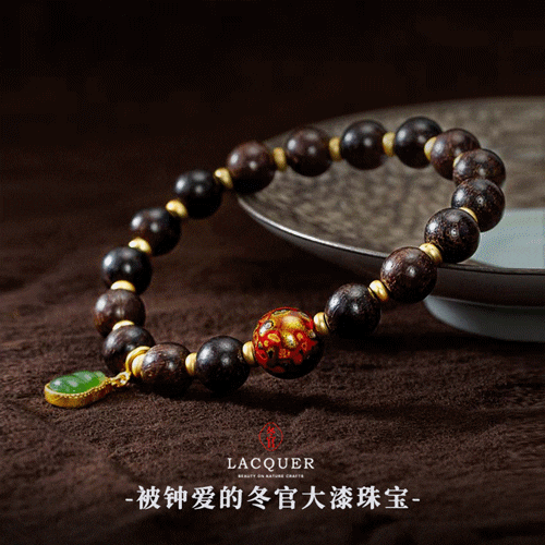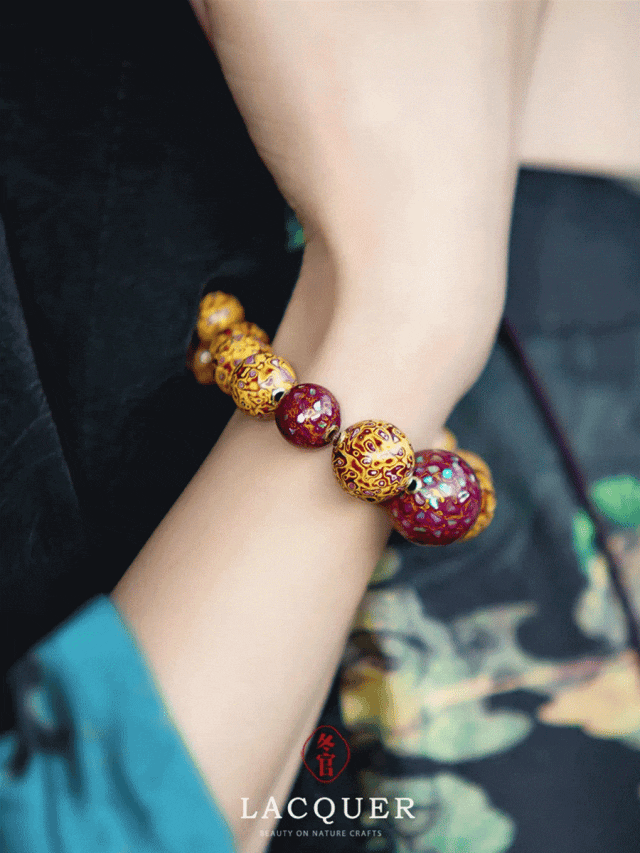 与红色松鳞斑纹的大漆珠遥相呼应,戴在手上显得既低调又华贵,很有东方韵味。